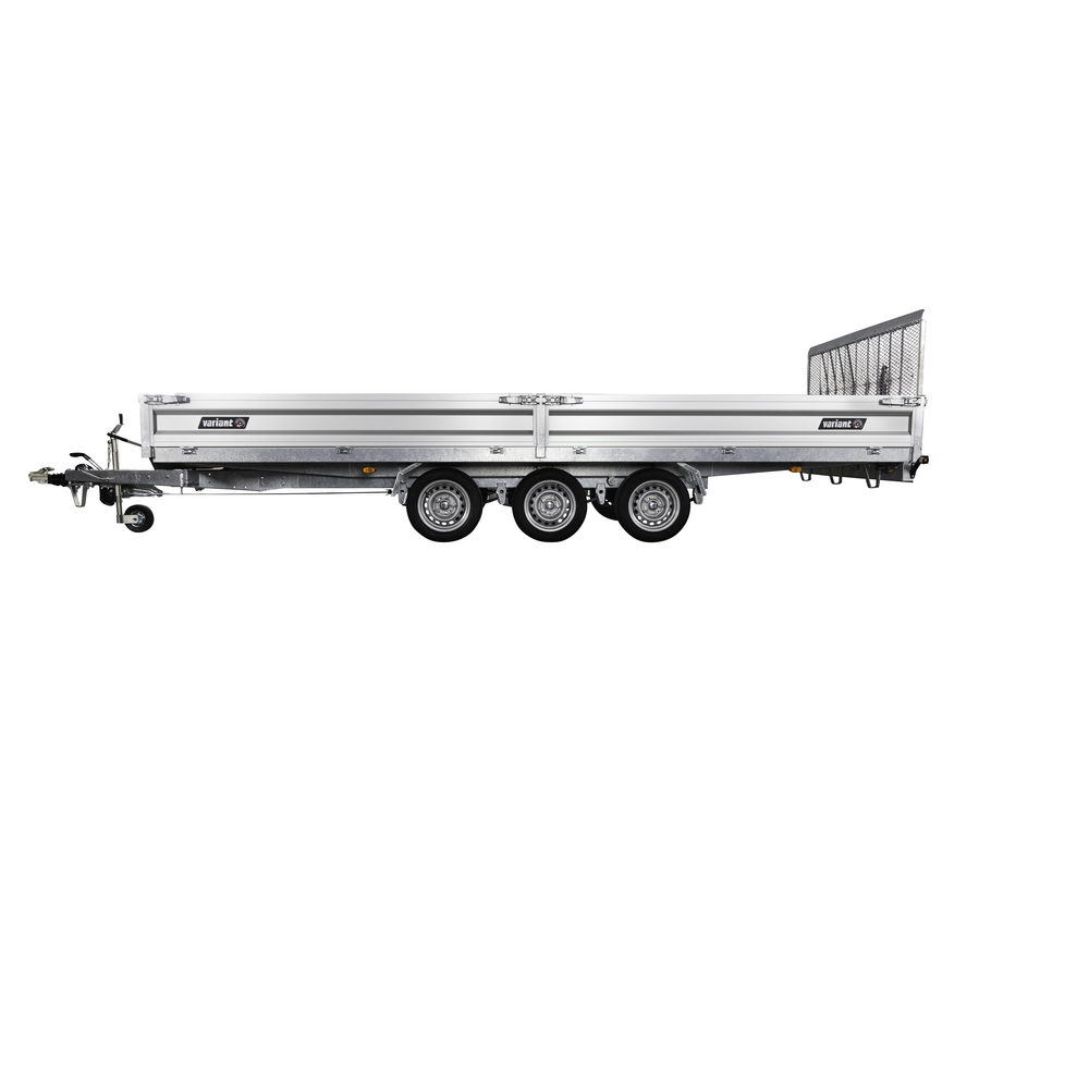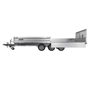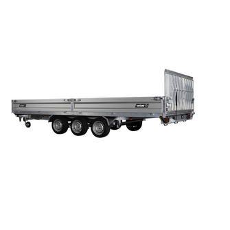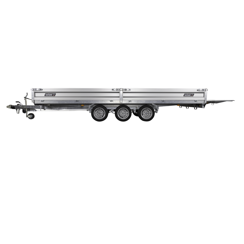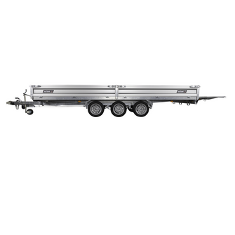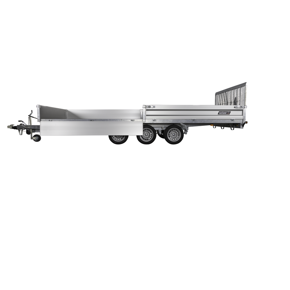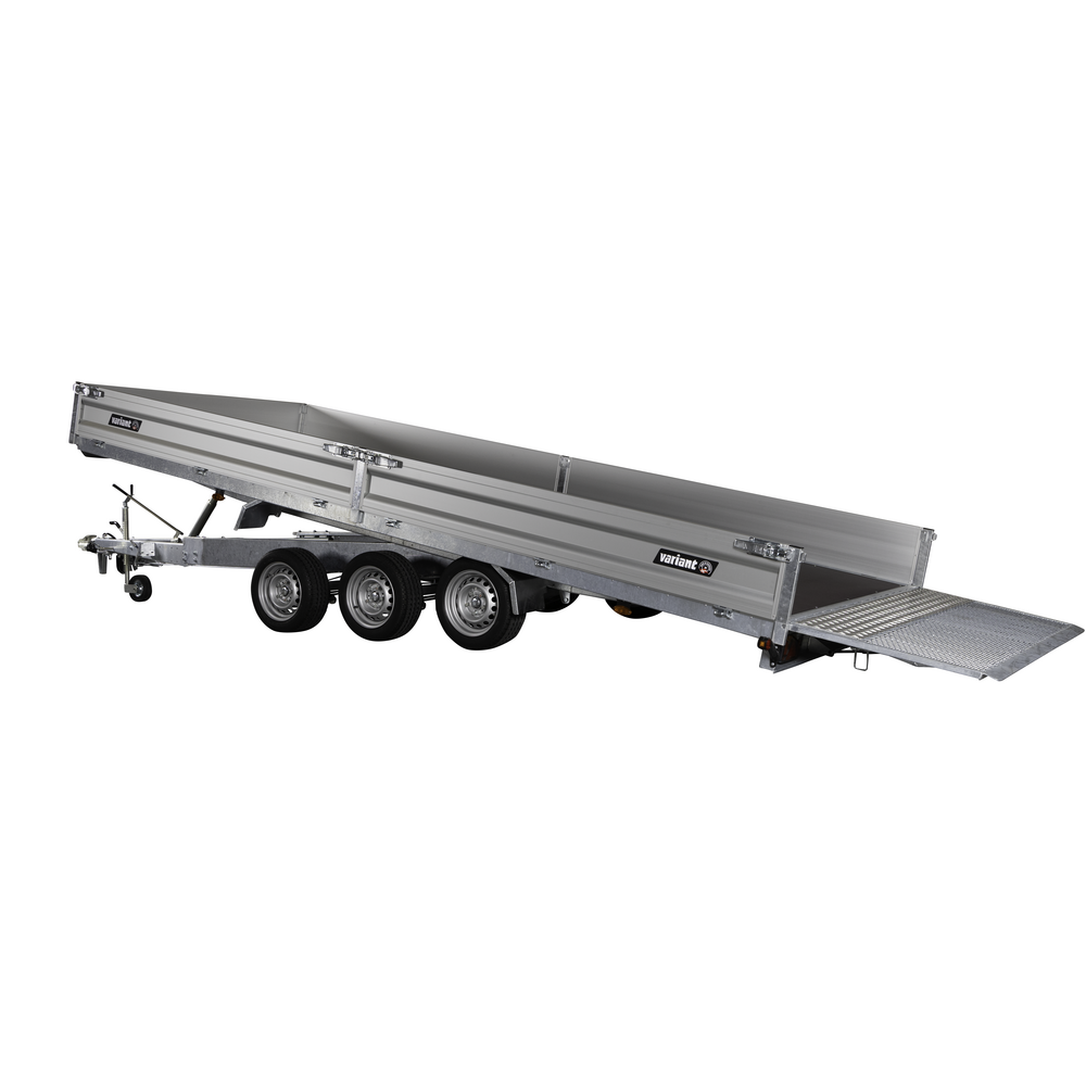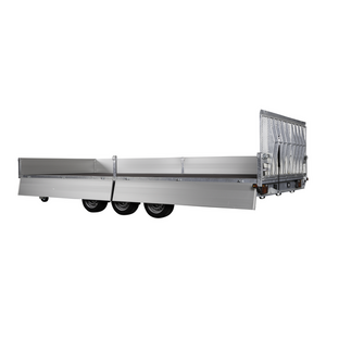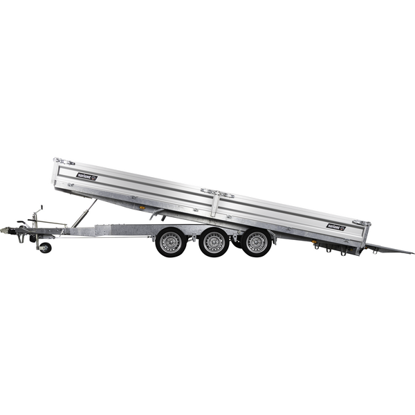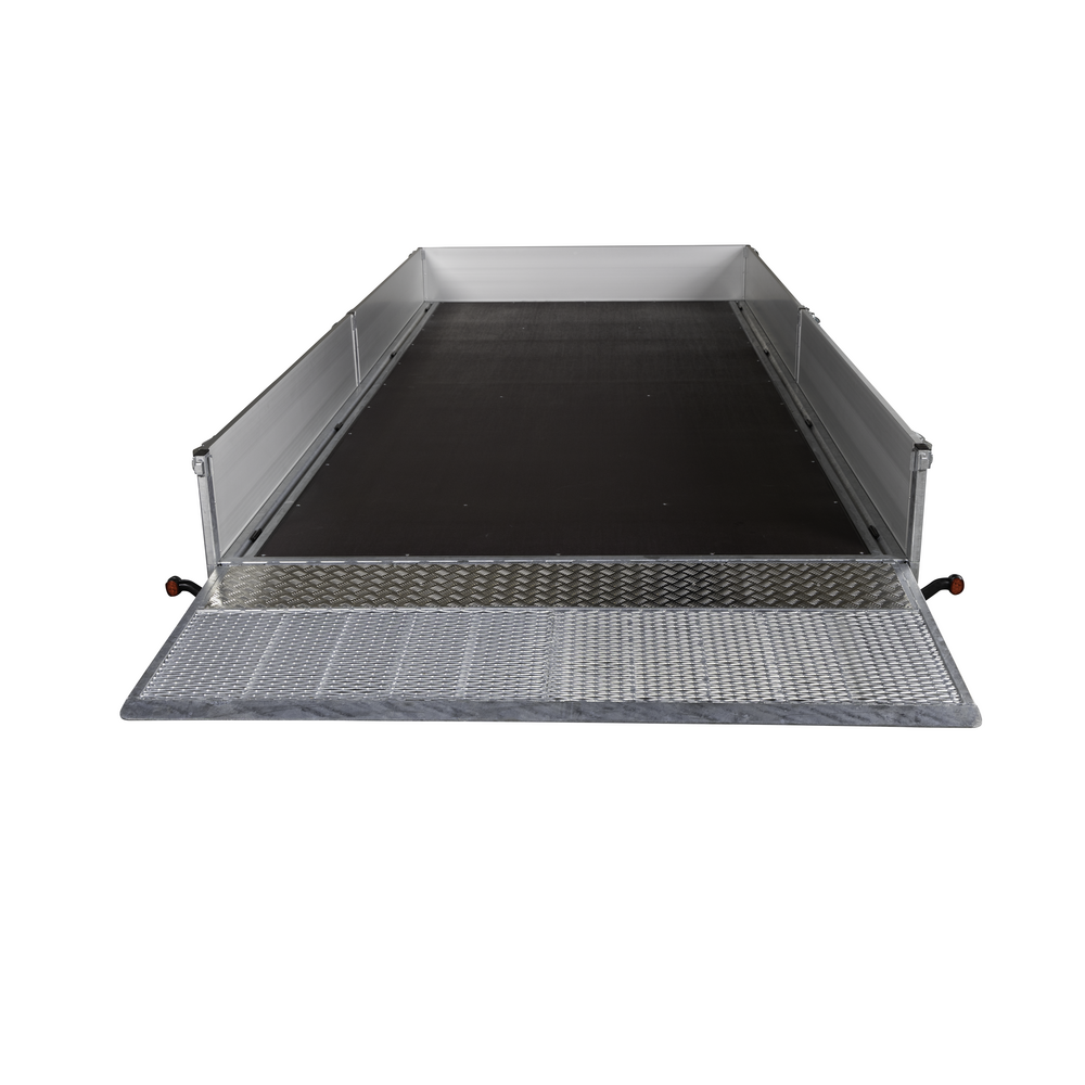 Traileren er udstyret med tre aksler og hjul placeret under chassiset, så ladets fulde bredde udnyttes. Den slidstærke alubund og de lette, robuste aluminiumssider giver høj holdbarhed og nem håndtering. Alle fire sider kan åbnes, hvilket gør lastning og aflæsning muligt fra enhver retning.