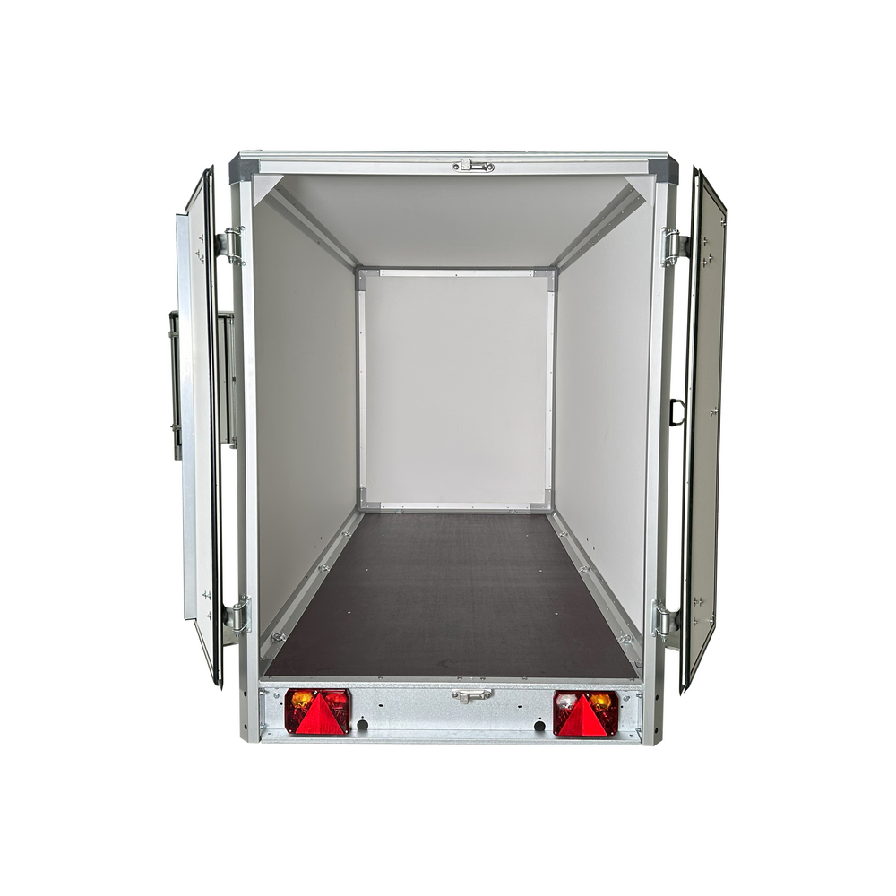 Traileren har sider og tag fremstillet i slidstærk finér, hvilket giver en robust og holdbar opbygning. Seks indvendige surringsøjer i bunden sikrer, at lasten kan fastgøres stabilt og sikkert under kørsel.