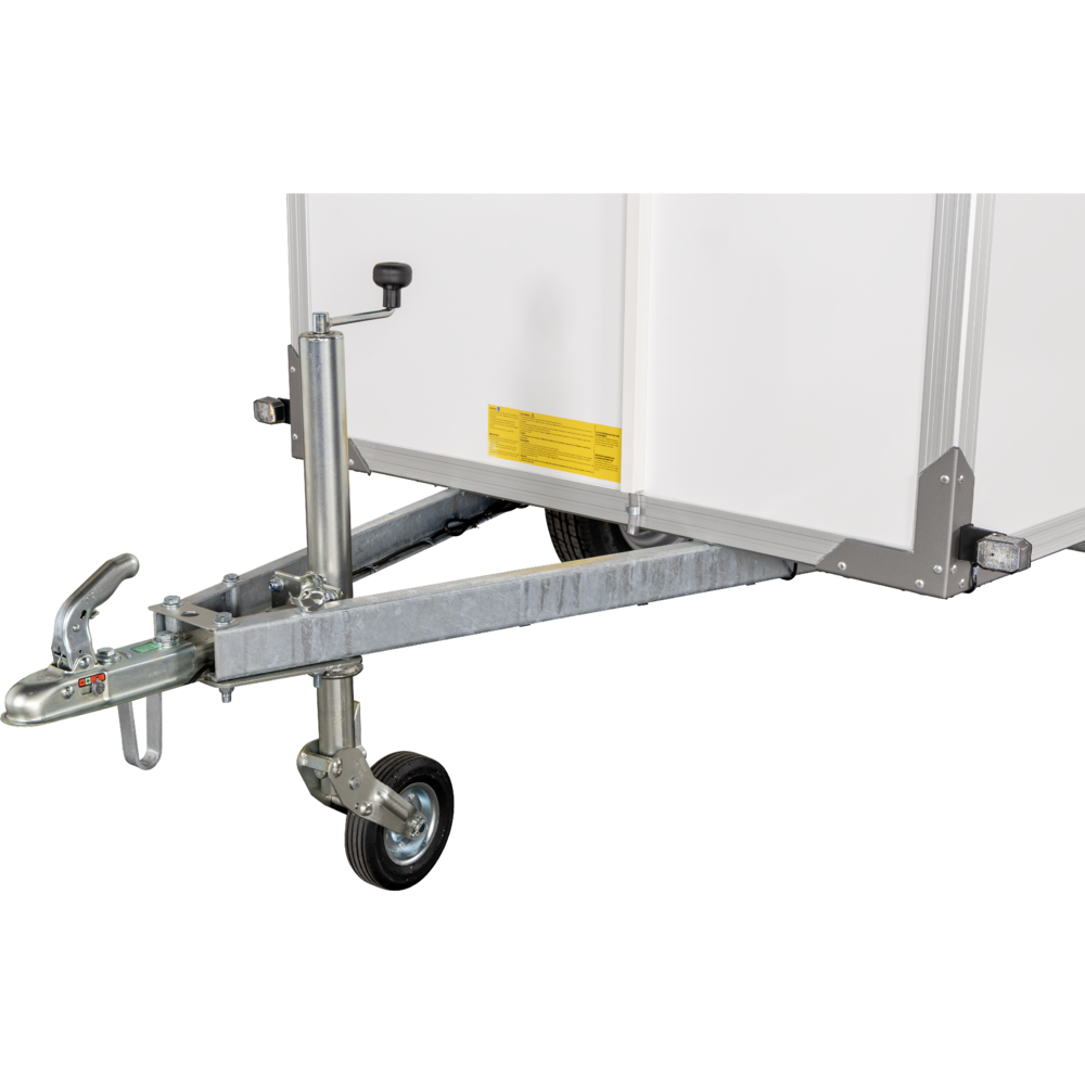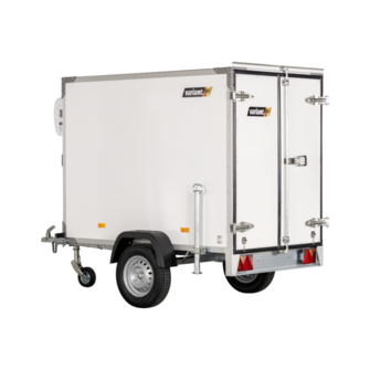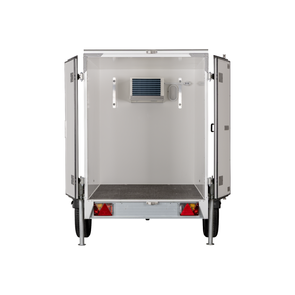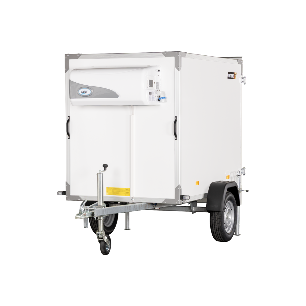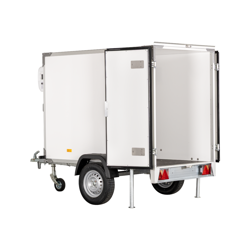 Traileren er opbygget med isolerede skumpaneler i sider, tag, bund og døre, som skaber et mobilt kølerum med optimal temperaturstyring. Den rengøringsvenlige finerbund gør vedligeholdelse nem, mens indvendigt 12 volt LED-lys giver god belysning ved lastning og aflæsning. Bagtil sikrer to støtteben stabilitet under parkering, og næsehjul medfølger som standard for lettere håndtering.