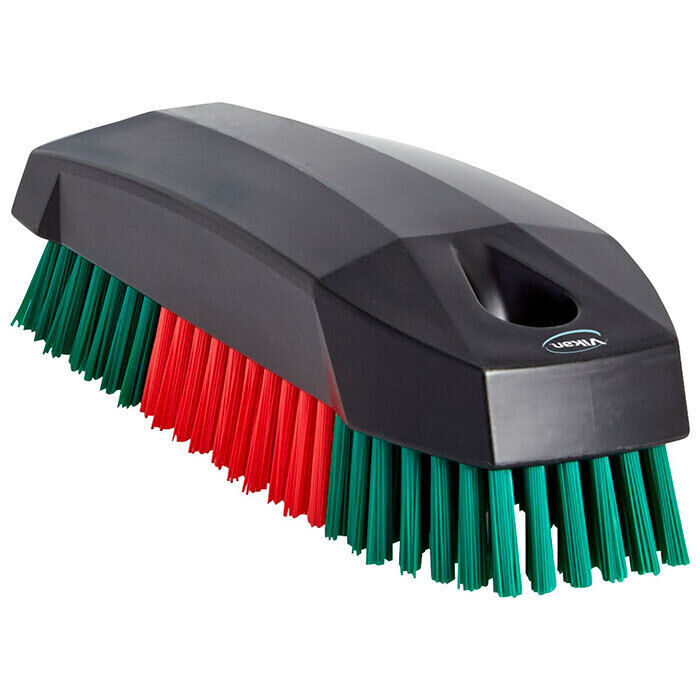 Neglebørste udført i sort polypropylen med stive røde/grønne filamenter.