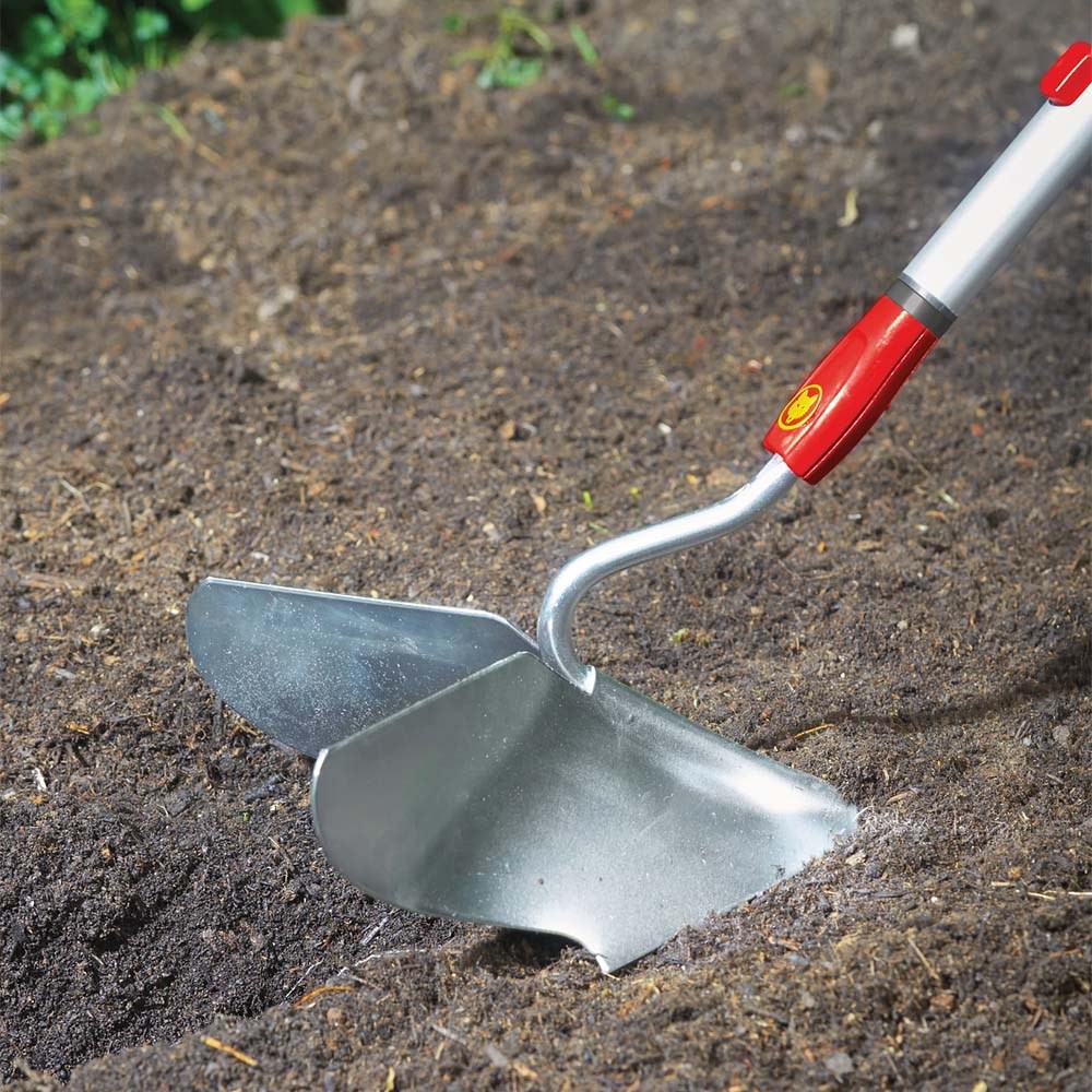 - Med skarpe bølgeskær, som effektivt skubber jorden op omkring planterne