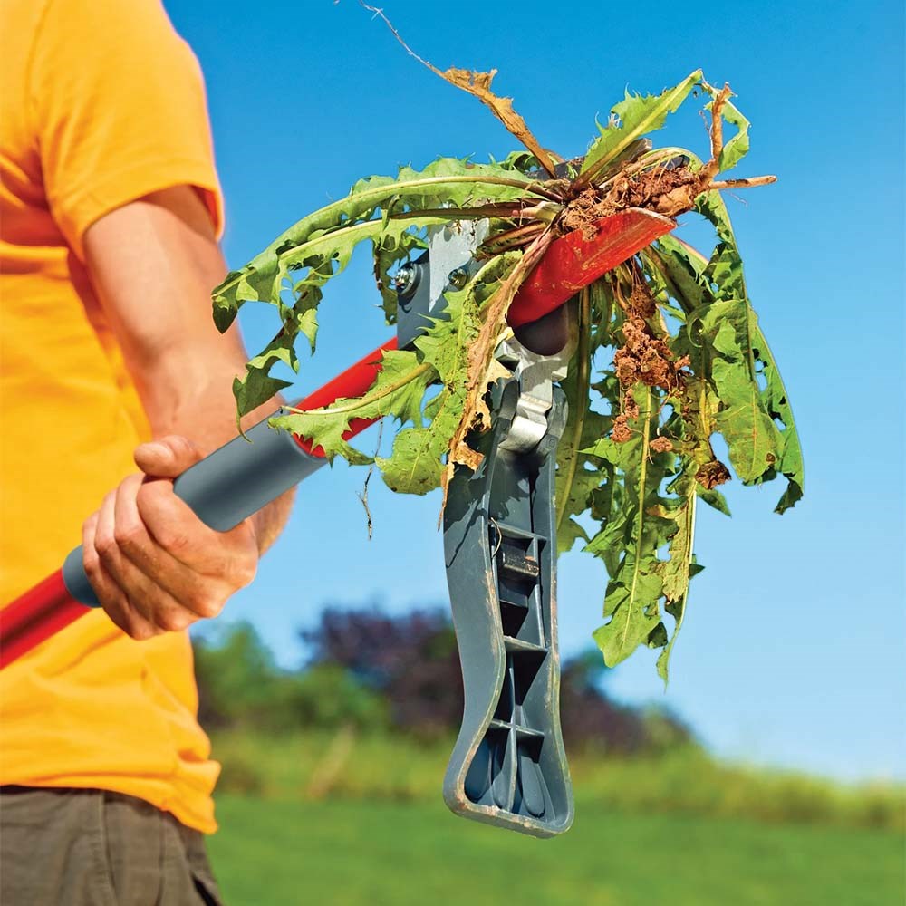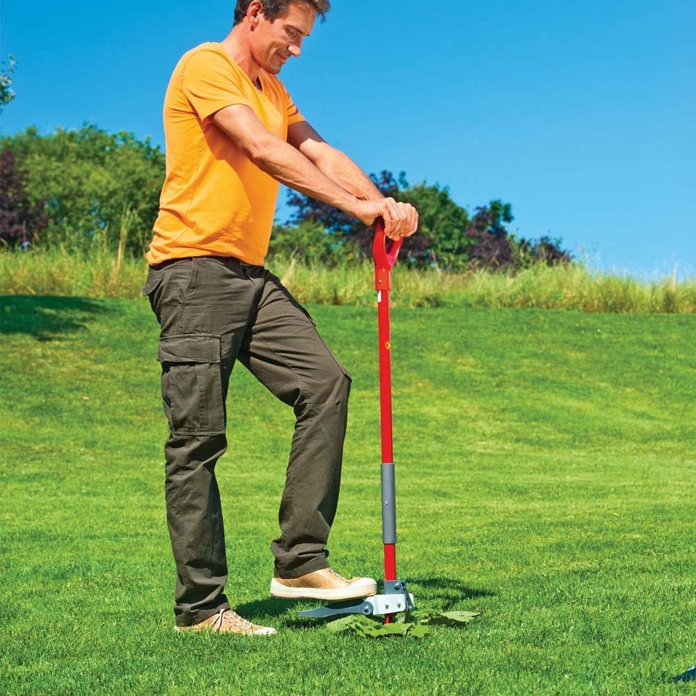 Med det stærke mælkebøttejern, som du her får inkl. et skaft med blødt D-greb, kan du hurtigt fjerne bl.a. mælkebøtter. Knivene af rustfrit stål trænger dybt ned i jorden, når du træder på den ergonomiske trædeplade, og derefter er det blot at dreje, trække ukrudtet op og fjerne det - færdigt arbejde.